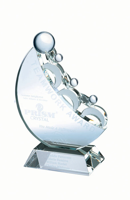 Optical Crystal Teamwork Award (US Copyrighted) - 3 People. This elegant award features 3 crystal people figures pushing a ball up the half moon body. Great award to show that teamwork withing partners. Great for any corporate event. Personalize it with your special message.