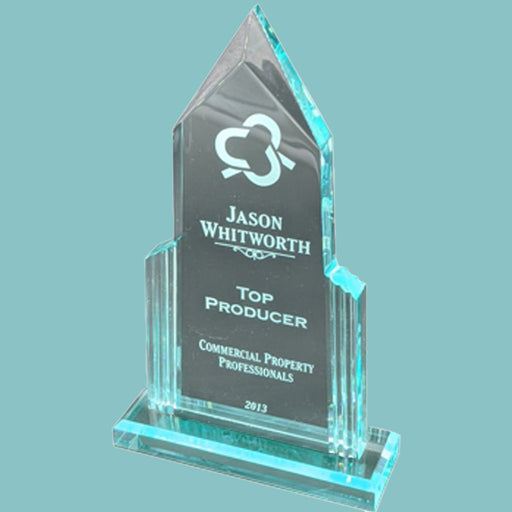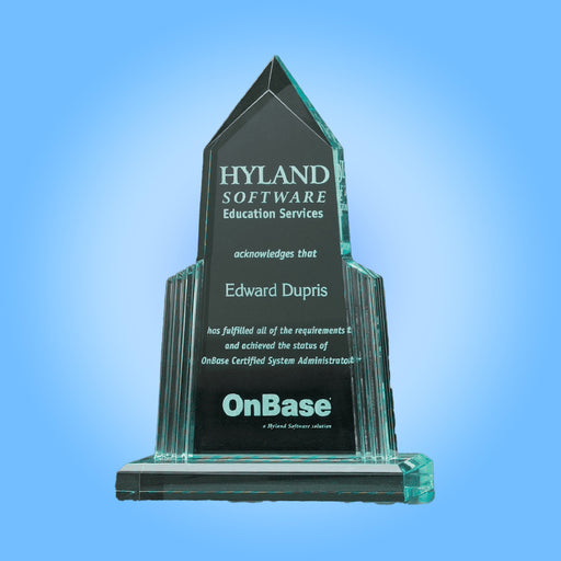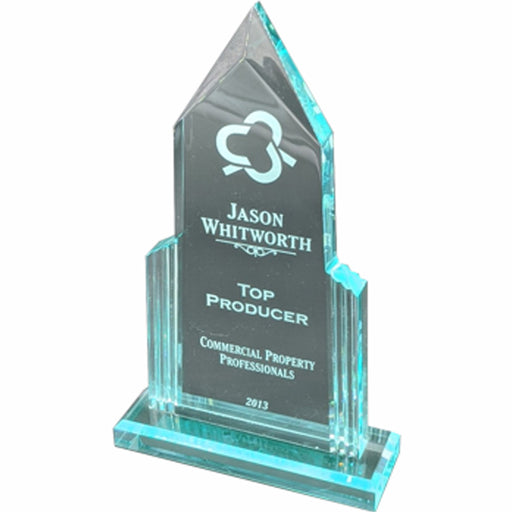 Crystals BuyCathedral Spire Series - 3/4" thick Jade acrylic upright award on jade acrylic base Solvent adhesive needed to attach base. Color engraves to fros...