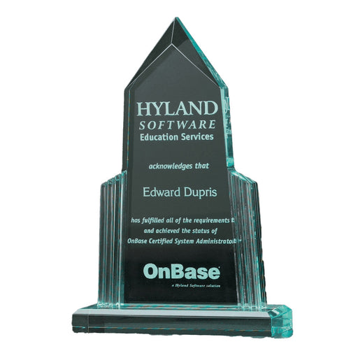 Crystals BuyCathedral Spire Series - 3/4" thick Jade acrylic upright award on jade acrylic base Solvent adhesive needed to attach base. Color engraves to fros...