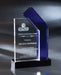 Unique shaped blue/clear crystal award for leadership and achievement.