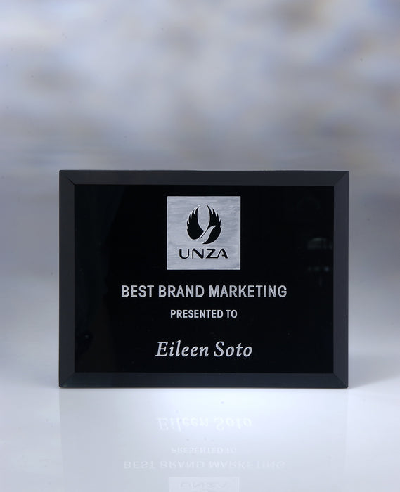 This sleek, clean, and professional item Black Glass Plaque - Large is great for awards. Comes in small, medium, and large sizes (this size is Large). This Black Glass Plaque - Large has the following dimensions: 8" x 10" x 5mm and is made of Glass. And for an additional charge of $42, one can engrave any names or special messages on product.