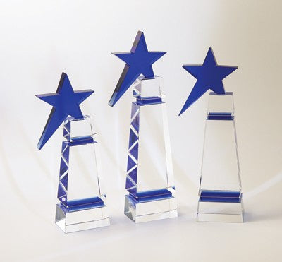 The Blue Star Tower Crystal Award - Small is an excellent award to show whose star. Comes in large, medium and small. Has the following dimensions: 9" x 3-1/4" x 2-3/8". It is made of Crystal and weighs 3.3 lbs (includes packaging). It includes a Blue Velvet Gift Box.