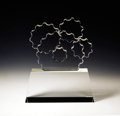 The Clustered Teamwork Crystal Award has the following dimensions: 10" x 9" x 2-3/8". It is made of Crystal and weighs 6.6 lbs (includes packaging) . It includes a Blue Velvet Gift Box.
