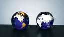Cobalt Blue Molten Glass World Globe Paperweight with Flat Bottom - Gold Continents. Great for a gift, looks fantastic in any office desk, or home. Can be used as an ornament or paperweight. Looks very fancy with etched and color filled continents.
