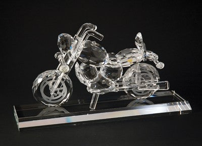 The Crystal Classic Motorcycle Figurine is a cool desktop piece for all Harley fans. (Base sold separately) This Blank Item product. Has the following dimensions: 8" L. It is made of Crystal and weighs 3 lbs (includes packaging). It includes a Blue Velvet Gift Box.