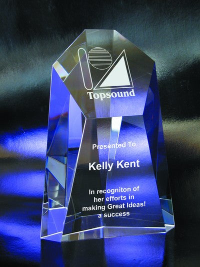 The Facet Hexagon Tower Crystal Award as the following dimensions: 7-1/2" x 5-1/4" x 2". It is made of Crystal and weighs 4.4 lbs (includes packaging). It includes a Blue Velvet Gift Box.