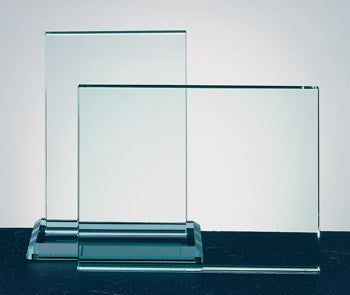 Jade Glass Rectangle Award with Base - XX Large. This award features a jade glass rectangle top with the slanted edge jade glass base attached. This item can be personalized with a logo or text. Item size is 10"H X 7"W X 1/2"D (top) and 11" x 3" x 1/2" (base). Item material is Jade Glass. Item weight with box is 4.6 lbs. Award is packed in a cardboard gift box.