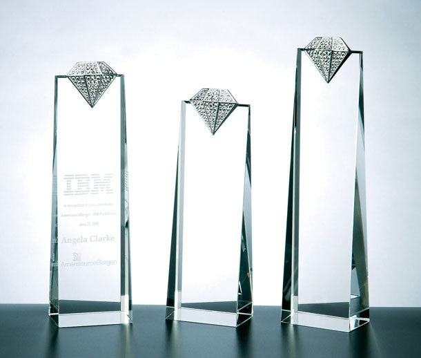 Optical Crystal Luxury Diamond Tower Award - Small. Fancy award features a metal diamond attached to the top of the crystal giving it a fantastic look of elegance.