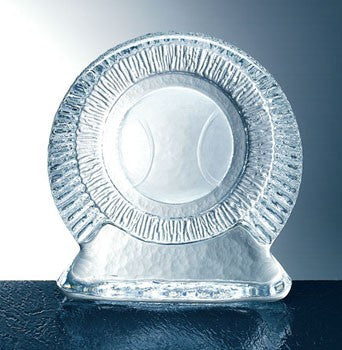 Molten Glass Tennis Iceberg Trophy. Item size is 4-1/2"H X 4-3/8"W X 1-1/4"D. Item material is Glass. Item weight with box with is 2.2 lbs.