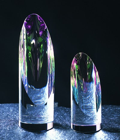 The Rainbow Slant Cylinder Crystal Award - small is a beautiful desk top piece. This is a Blank Item product. The price of the item displayed does not include engraving. Comes in large and small sizes (this size is small). Has the following dimensions: 3-3/8" H x 1-3/8" L x 1-3/8" W. It is made of Crystal and weighs 3 lbs (includes packaging). It includes a Blue Velvet Gift Box.